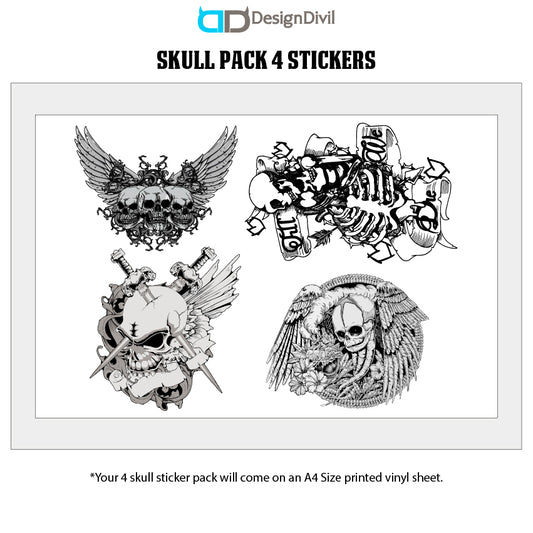 The Death Skulls 4 pack Decal Stickers. For Guitars & Basses. Also suitable for Gaming Consoles, Laptops, Walls or any flat smooth surface.